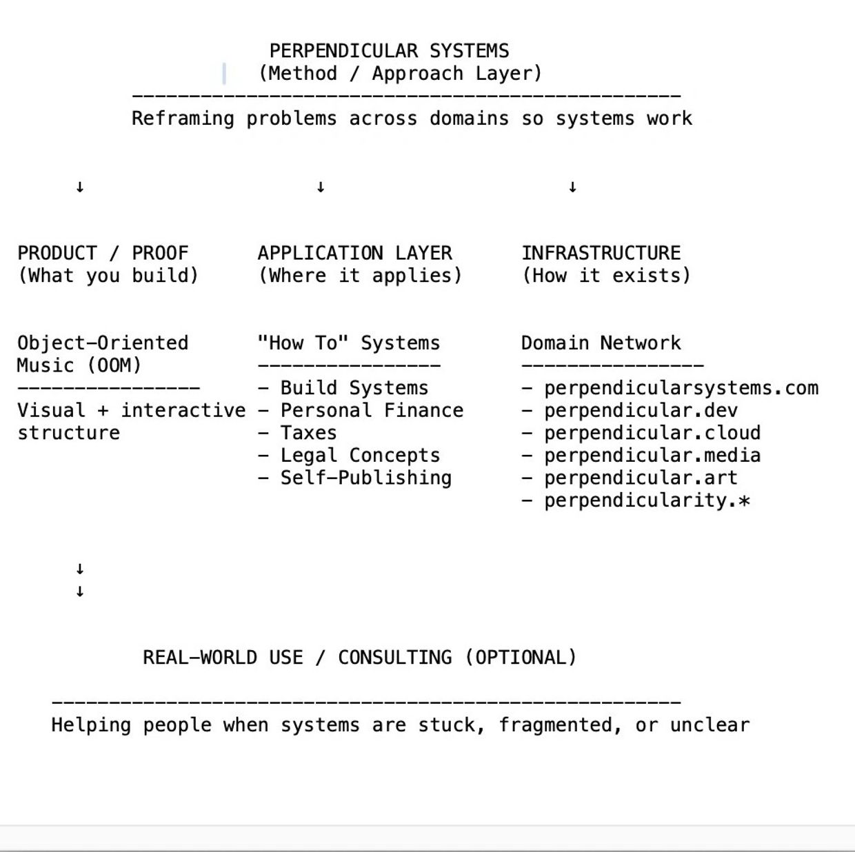 Perpendicular Systems is an ongoing body of work focused on making systems usable, coherent, and adaptable across domains.