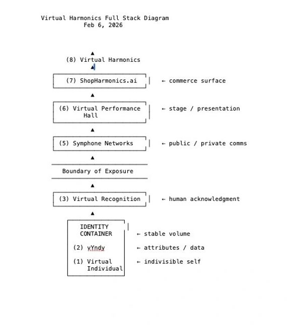 It describes how a bounded identity (individual, group, or organization) stabilizes internally, becomes legible through recognition, and then propagates outward through communication, performance, and commerce. Rather than treating identity, networking, and economics as separate concerns, Virtual Harmonics models them as resonant layers: identity as a stable core, recognition as the first relational surface, and higher-order systems as controlled extensions of that coherence.